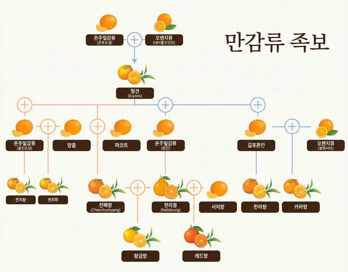 - 손자 1 (레드향): 한라봉과 서지향을 교배했습니다. 껍질이 붉고 당도가 가장 높습니다.